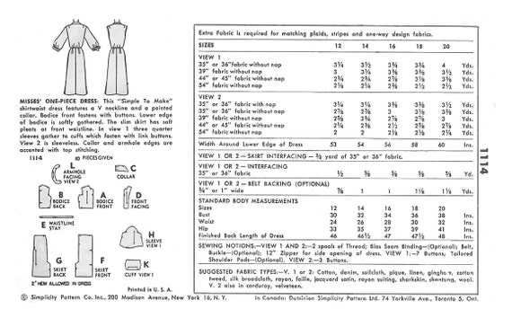 1950s Simplicity Pattern 1114 Easy Dress Size 14 Bust 32 Slim Etsy